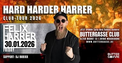 Felix Harrer bringt 2026 wieder kompromisslosen Club-Sound auf die Tanzflächen. Mit der „Hard Harder Harrer Clubtour 2026“ tourt der DJ und Produzent durch mehrere deutsche Städte und setzt dabei bewusst auf energiegeladene Nächte in ausgewählten Club-Locations.