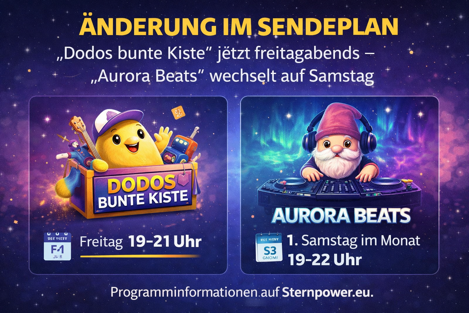 13 Jan., 2026 Änderung im Sendeplan: „Dodos bunte Kiste“ jetzt freitagabends – „Aurora Beats“ wechselt auf Samstag Sternpower-News